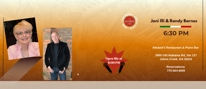 Altobeli's Restaurant & Piano 3000 Old Alabama Rd, Ste 127, Alpharetta, GA, United StatesJoin us as Joni Illi, accompanied by Randy, invites you to experience an evening filled with warmth and nostalgia. Together, they will serenade you with...