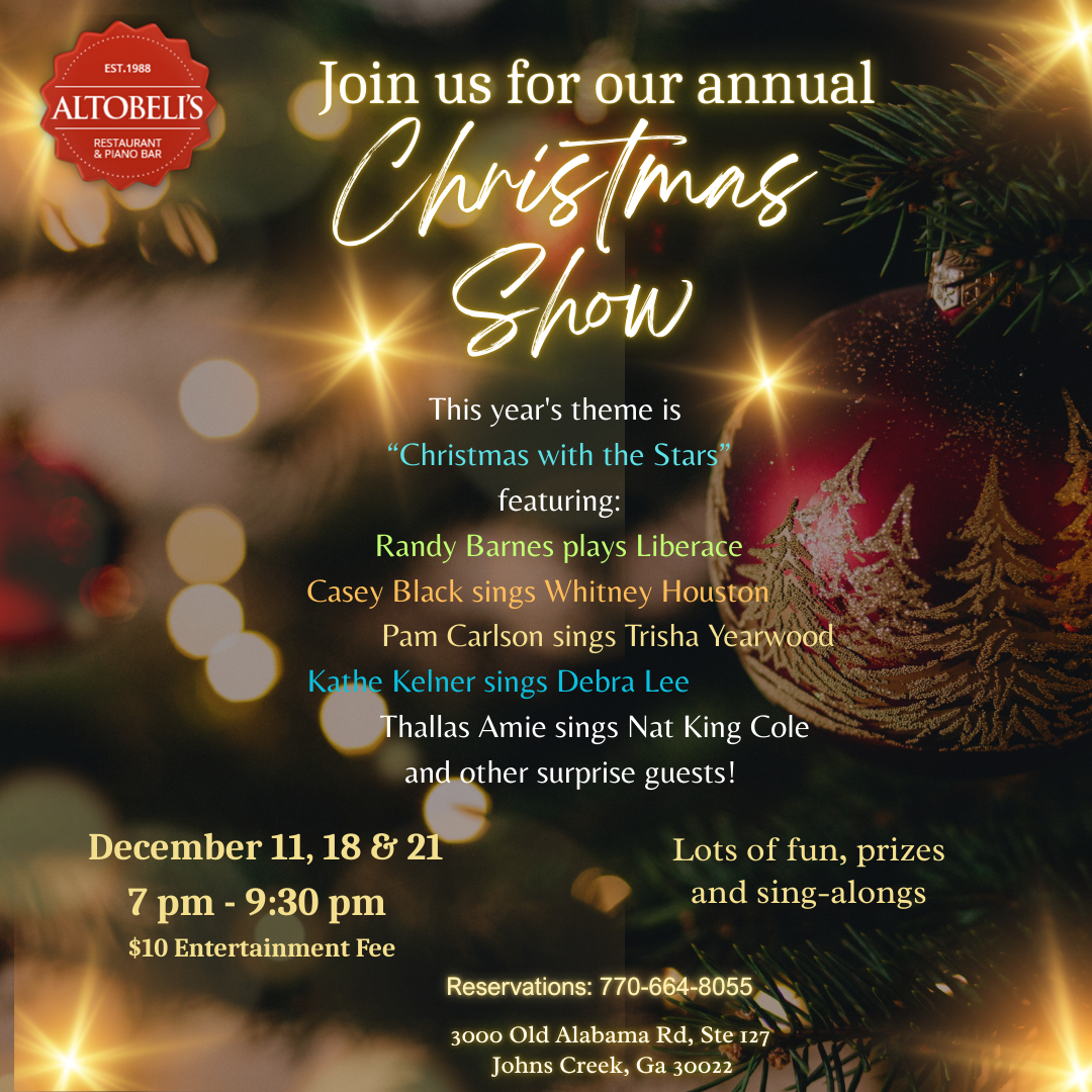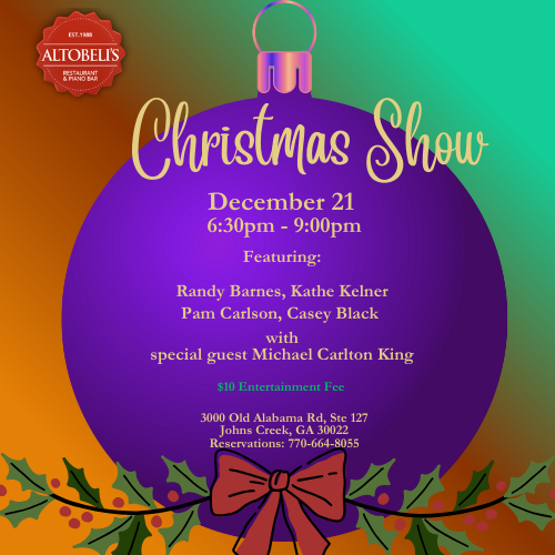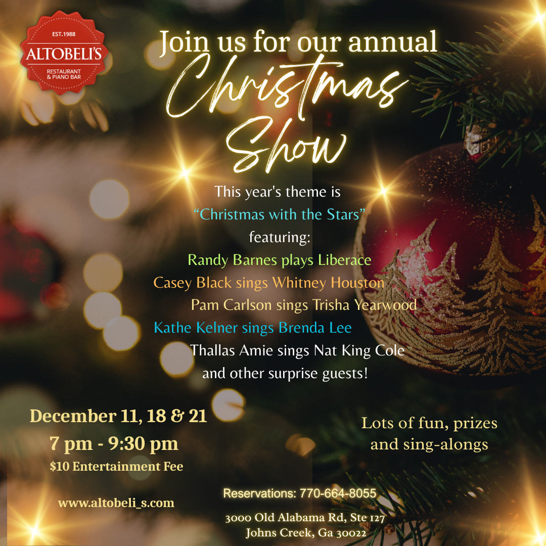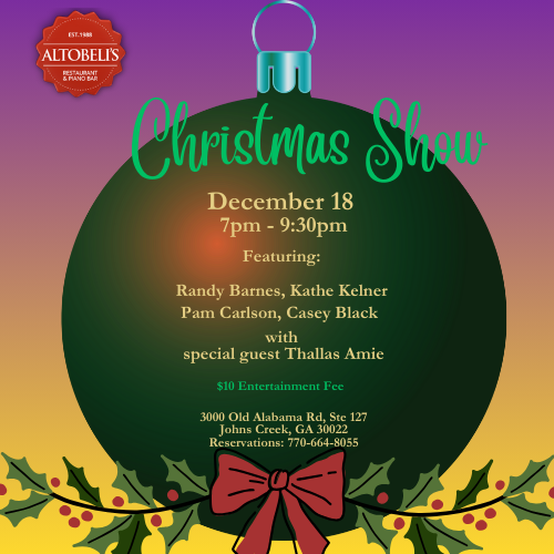 Altobeli's Restaurant & Piano 3000 Old Alabama Rd, Ste 127, Alpharetta, GA, United StatesJoin us for our last Christmas Show for this year! Enjoy holiday favorites and standards from some of your favorite artists with Randy, Kathe, Pam,...